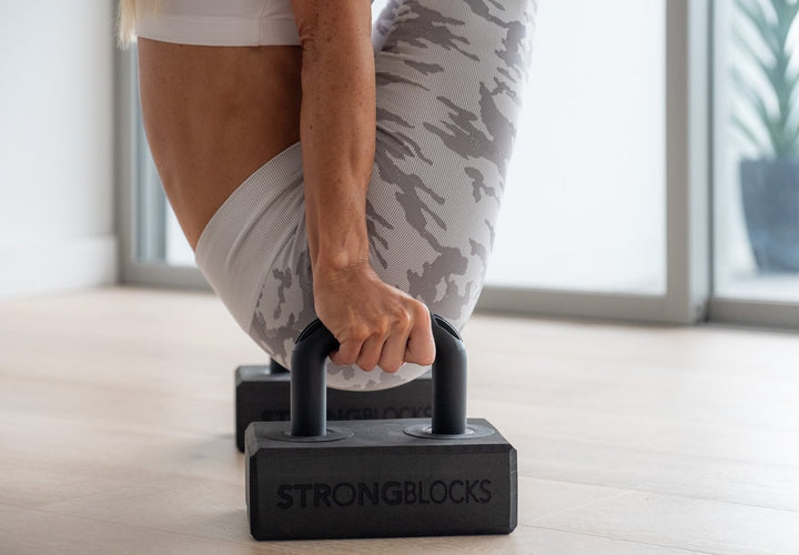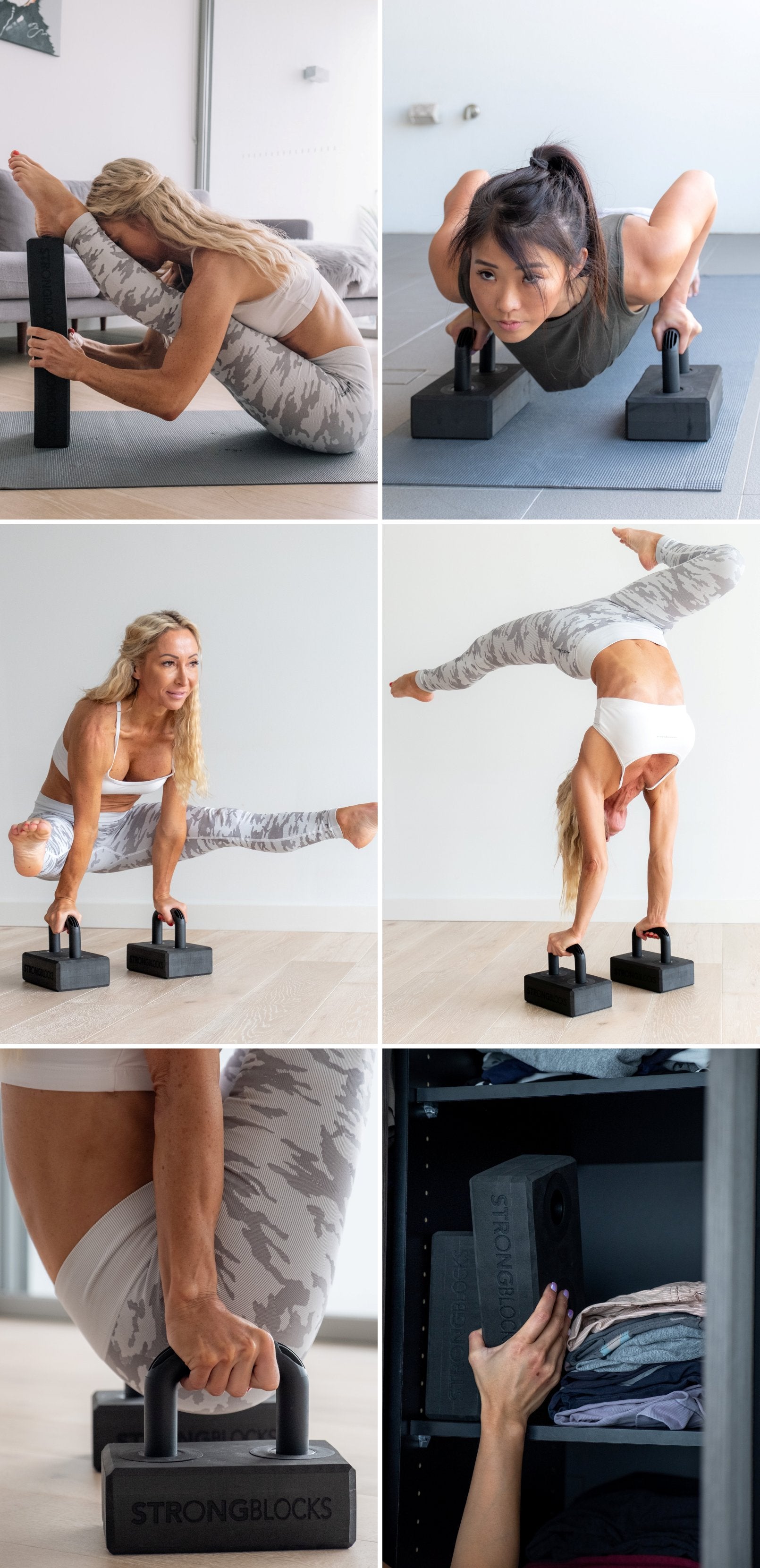 Meet the StrongBlocks, your new travel-friendly, workout. Combine strength and stretch in the same workout with a hybrid set of parallettes and stretching blocks. Perform upper body and core strengthening exercises using the parallettes, and scale the difficulty of your stretch with the blocks. Assembled in seconds without any buttons, pins or latches, and completely portable allowing you to workout anywhere.