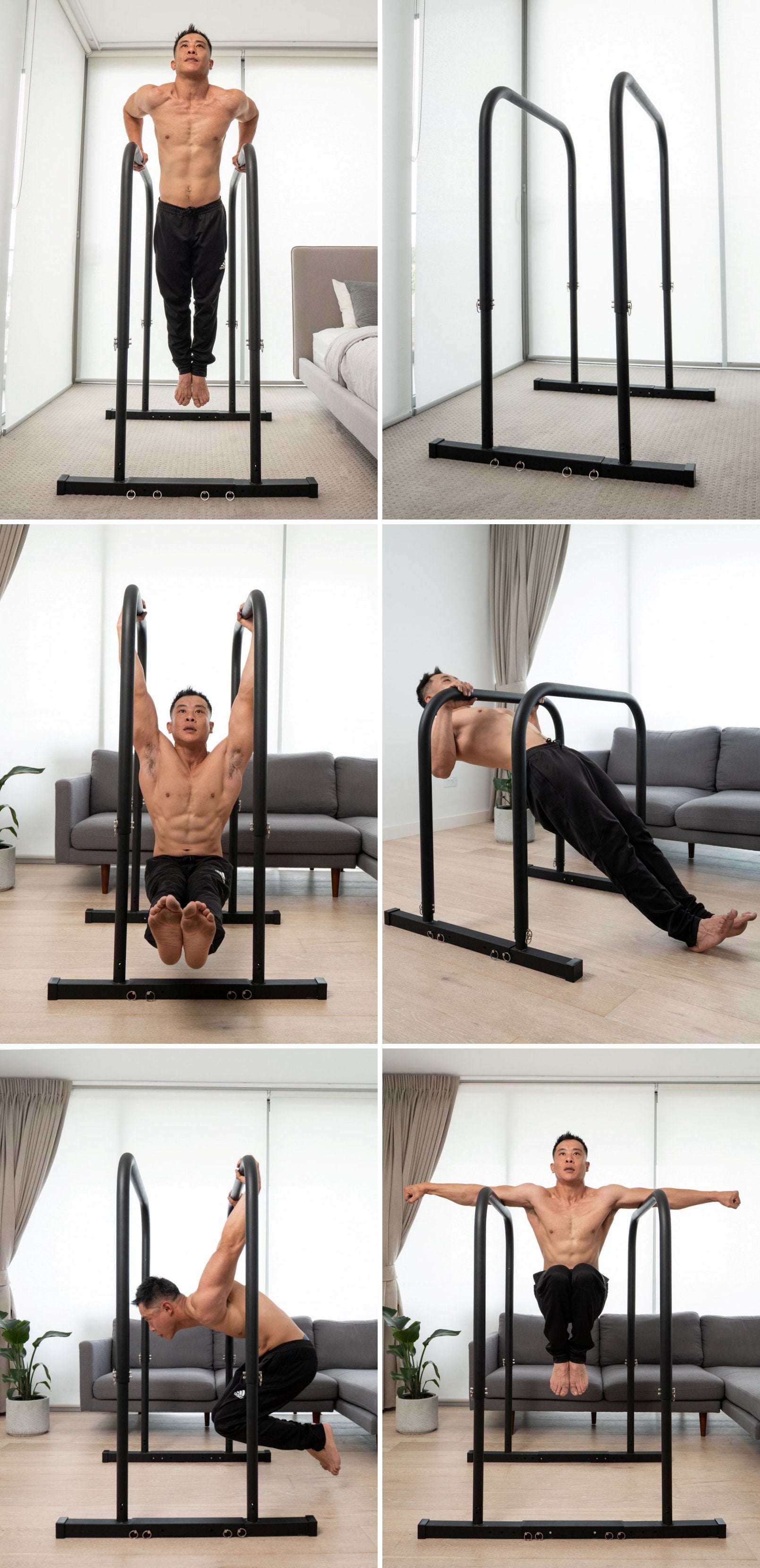 Meet our height- and width-adjustable parallel bars. Build complete upper body and core strength - perform chin-ups, pull-ups and leg raises from our top height (129cm), and dips, levers and rows from our bottom height (91cm). Width-adjustable (42cm to 61cm) for all shapes and sizes. Suitable for any experience level; perform feet-assisted dips and chin-ups if you are just getting started, or strict muscle-ups if you are an advanced user. Fast setup, completely freestanding and stores flat after your workout ends.