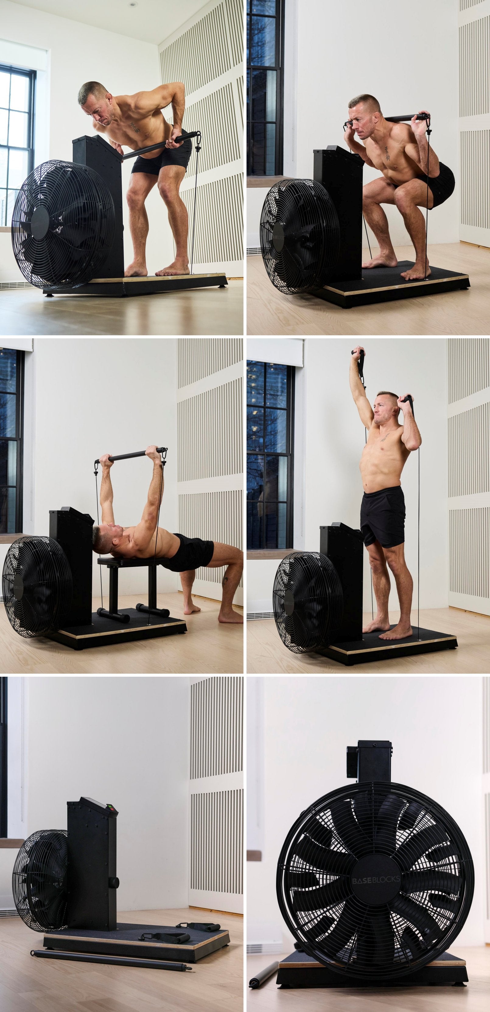 Completely powered by air tech with resistance up to 110kg. No changing weights; the harder you go, the higher the resistance. Perform full-body workouts with deadlifts, squats, lunges, rows, presses and more. Includes two handles, a bar, and a performance monitor to let you see real-time workout metrics. Co-designed by former UFC welterweight and middleweight champion, Georges St-Pierre. Mini Bench included.