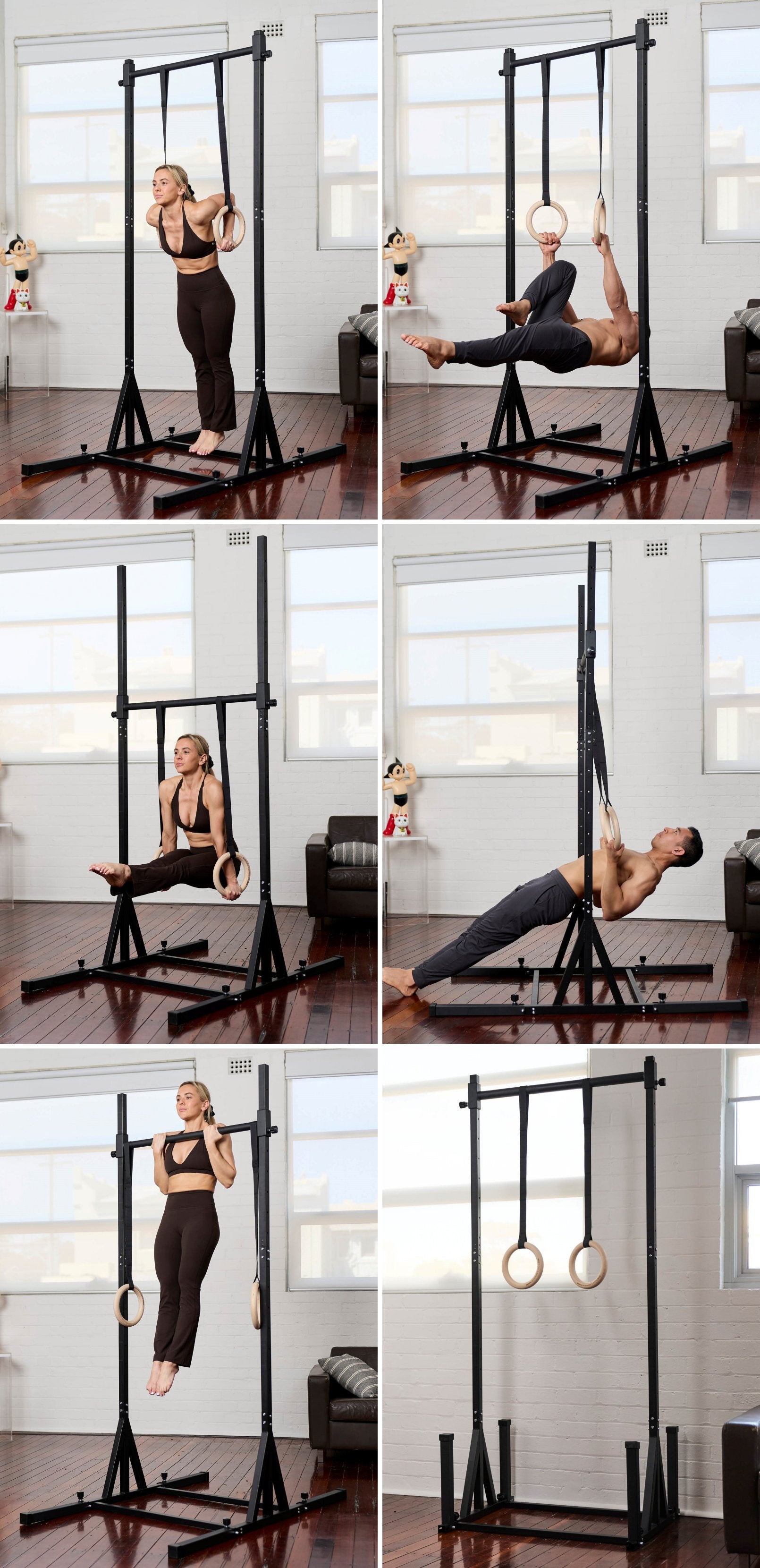 Our completely portable, freestanding rig designed for gymnastics rings at home. Make any exercise harder by adding instability. No more adjusting straps - just slide the bar to set the rings at the same perfect height, every time, in seconds. Also doubles as an all levels pull-up bar – simply slide the rings to the side (lower the bar for feet-assisted chin-ups if you’re a beginner). Fixed-length, single-strap design for a cleaner look. Lightweight, portable with foldable feet for compact storage. Rings and straps included.