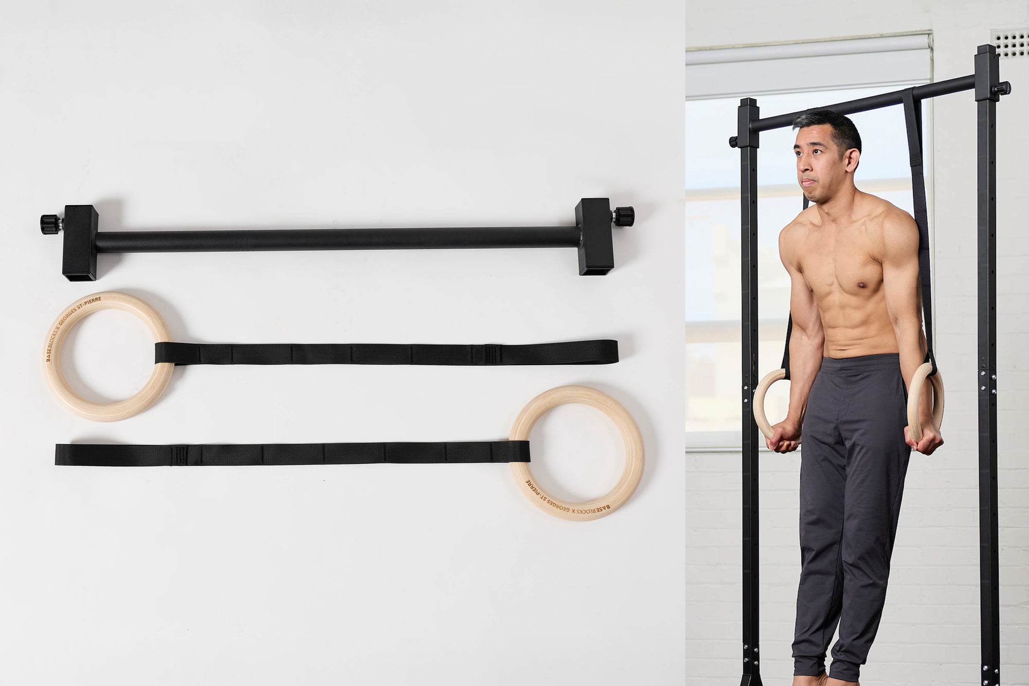 Meet our new add-on for the Big Bar Plus. A smaller diameter bar (38mm) with fixed-length single-strap gymnastics rings for a cleaner look. Our first bar with knurling for a better grip, making it suitable for the whole home. Rings straps not fixed - simply slide them to the side to use the pull-up bar.