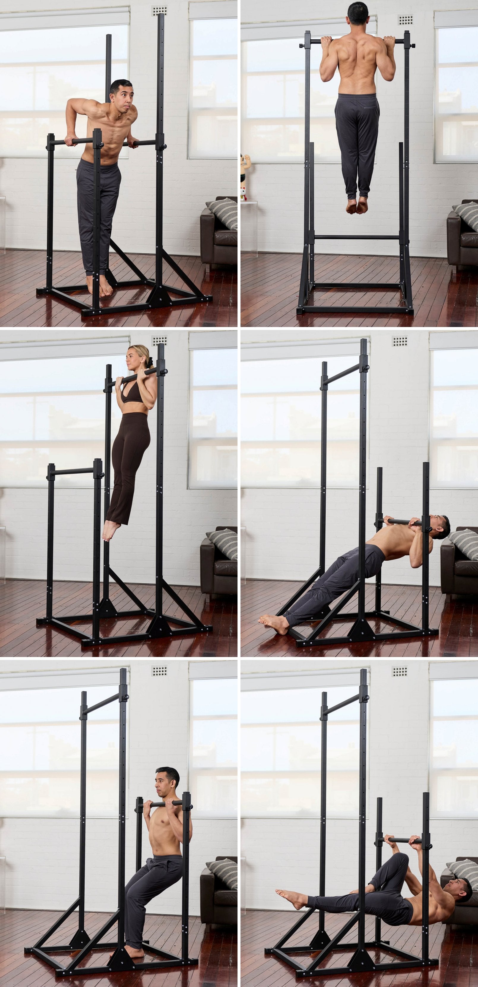 Height-adjustable for any upper body exercise. Two pull-up bars that meet in the middle to create parallel bars for dips, L-sits and front-support exercises.