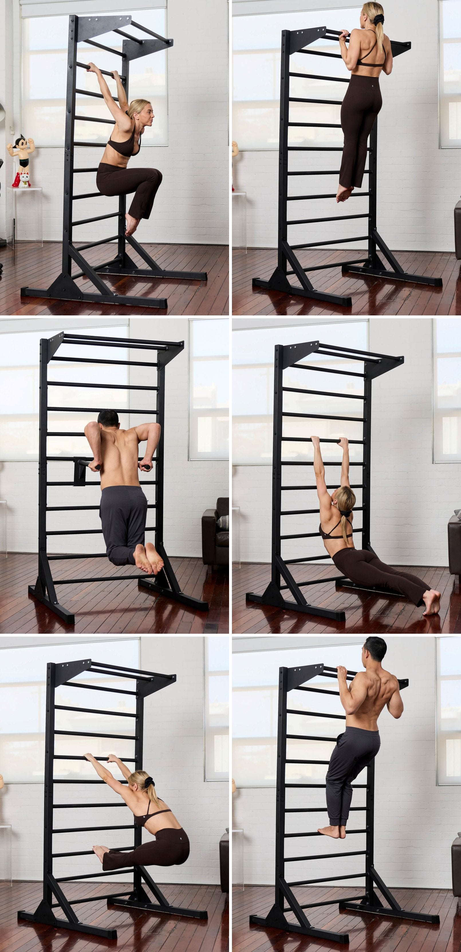 Classic wall-bars re-designed without the wall. Completely freestanding with an in-built pull-up bar and removable dip bars for upper body strength. Increase your pike, straddle and thoracic flexibility with exercises using the horizontal bars for a deeper stretch, perform strict hanging core exercises on the core bar, and use the in-built pull-up bar for pull-ups and chin-ups (use your feet on the horizontal bars if you are a beginner). Clip and dip to install parallel bars in seconds. Stable enough for human flag training.